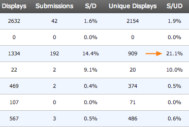 Explanation: The above shows opt-in aka subscriber statistics from May 2013, 6 months into Dear Blogger. S/UD is the number of subscribes per unique display, aka how many people joined in who showed up. As the eBook was a gift, new subscribers signed up for, I associate subscriber stats closely with downloads.